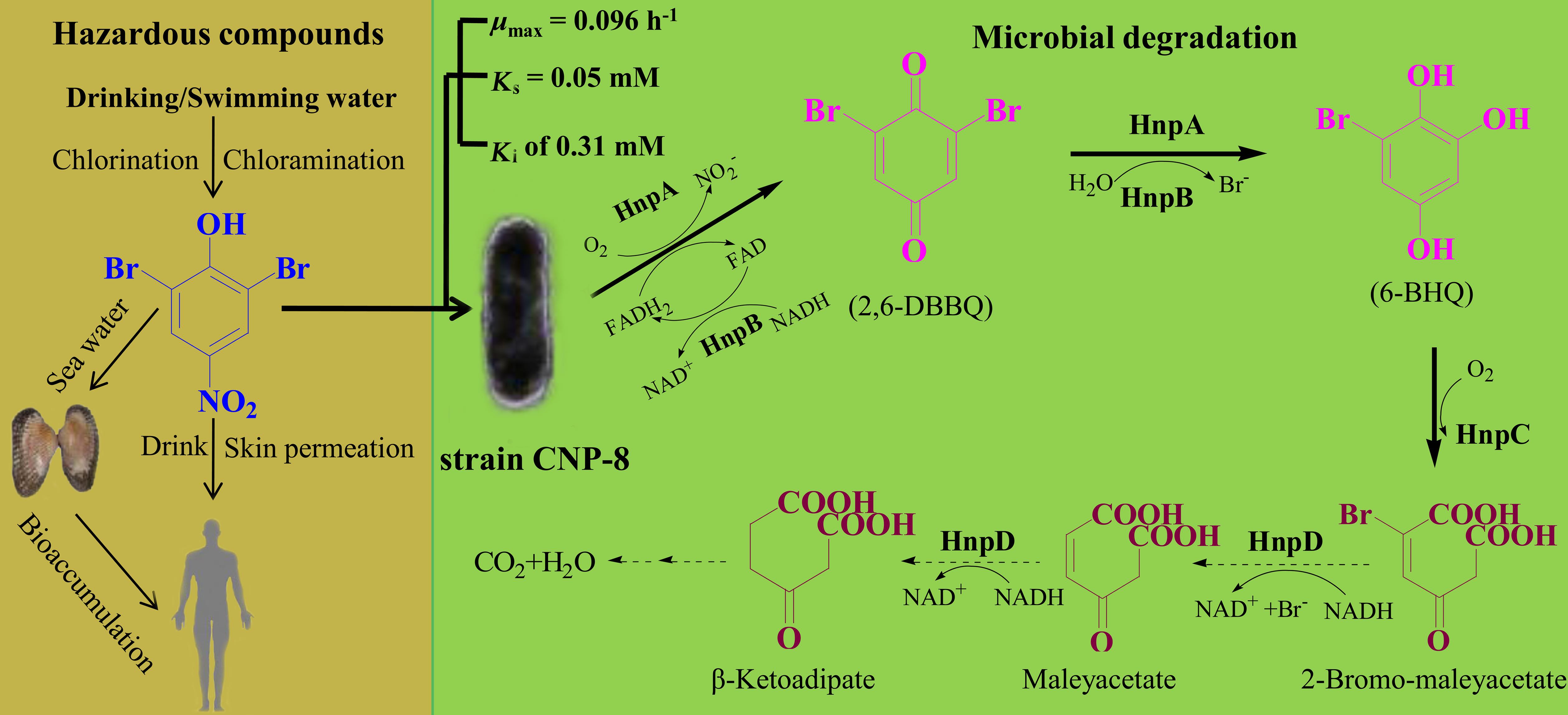 中国科学院烟台海岸带研究所“海洋环境微生物与生物技术”团队近期筛选到一株能够利用2,6-DBNP作为唯一碳源、氮源和能源生长的细菌(Cupriavidus sp. strain CNP-8)。团队结合基因组、转录组、和RT-qPCR分析鉴定了CNP-8菌株中参与2,6-DBNP代谢的基因簇(hnpABCD)。对参与代谢的关键酶HnpA、HnpB和HnpC进行了表达、纯化和鉴定,发现FADH2依赖的单加氧酶(HnpA)在黄素还原酶(HnpB)协助下能顺序催化2,6-DBNP的脱硝基和脱溴反应生成6-溴-偏苯三酚(6-bromohydroxyquinol, 6-BHQ);HnpC催化6-BHQ双加氧反应开环,随后由马来酰乙酸还原酶(HnpD)进一步降解进入三羧酸循环。基因敲除和互补揭示hnpA基因是菌株CNP-8降解2,6-DBNP必需的基因。该研究首次报道微生物降解2,6-DBNP的过程和分子机制,研究结果近期发表在国际著名学术期刊Journal of Hazardous Materials(1区 Top,IF=6.434)。