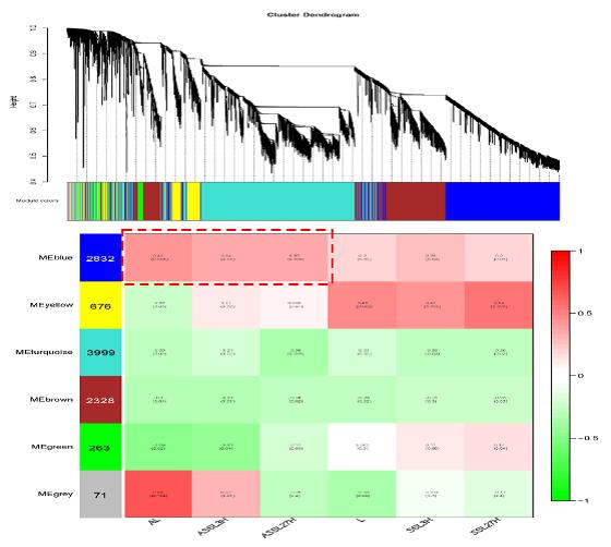 图1: 加权基因共表达网络(WGCNA)分析及性状-模块相关性分析显示AM菌根化田菁中存在与盐胁迫相关的特殊基因群,见图中红色虚线。