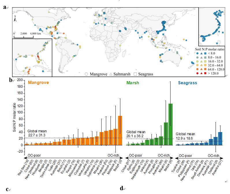 图1 全球蓝碳生境土壤N:P摩尔比空间分布(a),不同国家土壤N:P摩尔比对比(b)和土壤OC与N(c)、P(d)含量相关性