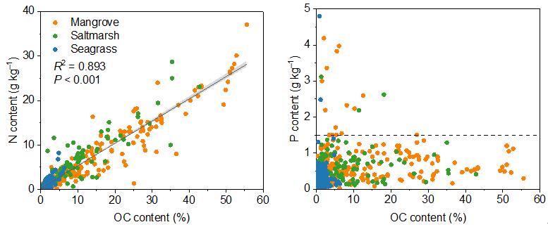通过对比全球797个点位蓝碳生境土壤OC、N和P密度得出,中国蓝碳生境属低OC含量矿物型生境(图1),其土壤C:P低于全球均值4-8倍,N:P低于全球均值4-5倍,植物C:P、N:P和C:N均相对偏低,说明外源型低OC含量蓝碳生境存在土壤N限制。全球范围内,土壤N含量随OC含量增加而增加,但土壤P含量相对稳定且低于1.5 g kg–1。