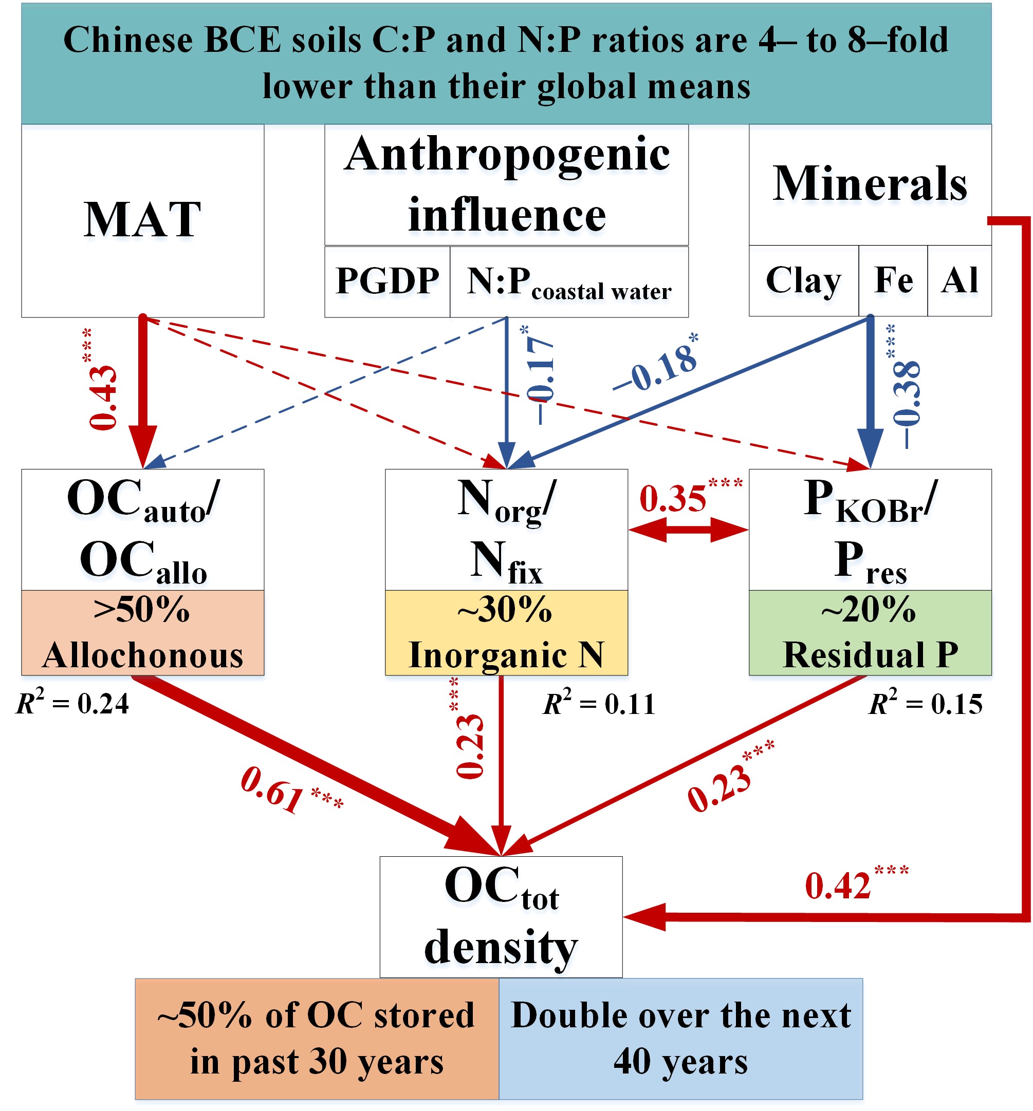 外源OC(陆源+海源)占中国红树林表层土壤OC的50%,占中国盐沼和海草床表层土壤OC的75%,其中77%、70%和60%的红树林、盐沼和海草床外源OC来自陆源(河流)输入。通过KOBr氧化法,区分土壤有机氮(Norg)、固定态铵(Nfix)的比例,同时评估氧化态OC(OCKOBr)和P(PKOBr)与残渣态OC(OCres)和P(Pres)的比例。土壤OCKOBr、Norg和PKOBr的比例非常接近,分别占总量的77%、71%和80%,并且氧化态与总量存在很好的线性关系。Nfix占红树林、盐沼和海草床表层土壤N的25%、37%和26%。年平均气温(MAT)和内源/外源OC(OCauto/OCallo)间存在正相关,与亚热带和热带区域红树林较高的内源OC一致。人类活动因子对Norg/Nfix存在负相关影响,可能说明了富营养蓝碳生境有机质降解的反硝化效应。这一效应虽然可提高N的去除,但会减少有机质储存并且会释放氮氧化物温室气体。黏粒和Fe/Al氧化物对Norg/Nfix和PKOBr/Pres存在负相关影响,但与土壤OC密度正相关,说明矿物是控制外源型蓝碳生境土壤C、N、P循环的重要因素(图2)。
