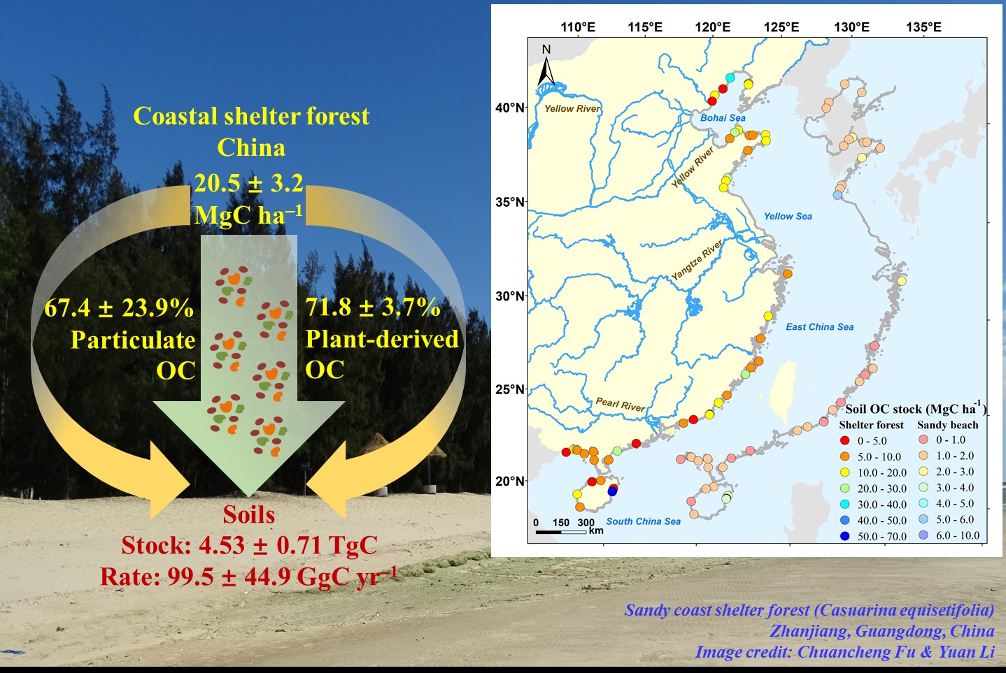 Li, Y., Fu, C.C., Wang, W.Q., Zeng, L., Tu C., Luo, Y.M.* An overlooked soil carbon pool in vegetated coastal ecosystems: National-scale assessment of soil organic carbon stocks in coastal shelter forests of China. Science of The Total Environment, 2023, 876, 162823. https://www.sciencedirect.com/science/article/pii/S0048969723014390.