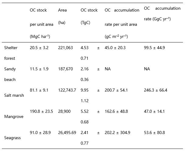 表1 海防林和其他蓝碳生境土壤OC储量和速率