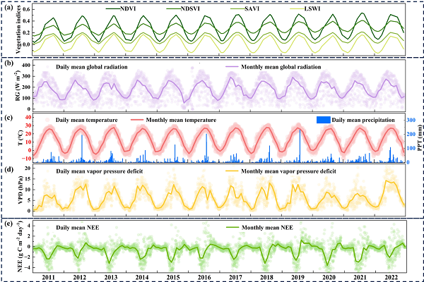 图1 自然修复湿地生态系统环境数据及CO2交换(NEE)长期监测数据