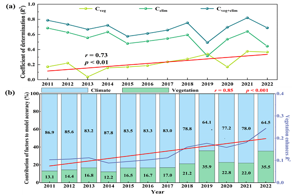 本研究将环境因子划分为植被因子(基于长时序遥感指数)和气候因子(来源于气象监测数据),结合多元逐步回归与机器学习方法,从多时间尺度和不同恢复年限两个维度系统评估了二者对修复湿地碳通量的相对贡献。结果表明,滨海湿地长达12年的自然恢复过程中,植被与气候因子共同决定生态系统的CO₂净交换量(NEE)。随着时间尺度延长,气候因子为NEE年际变化的主要驱动因素,但植被对NEE变异的解释能力逐渐增强(图2)。进一步的年度尺度分析表明,在基于气候因子的模型中引入植被因子可显著提升模型解释力,且随着恢复年限增加,提升效应更为明显(图3)。这说明植被改善过程在一定程度上减弱了气候因子对CO₂封存能力的主导影响,从而增强了生态系统碳汇功能的稳定性(图4)。本研究定量揭示了气候与植被在长期演替过程中对NEE的协同调控机制,并凸显了植被恢复和演替动态在维持和增强滨海湿地固碳功能中日益重要的作用。