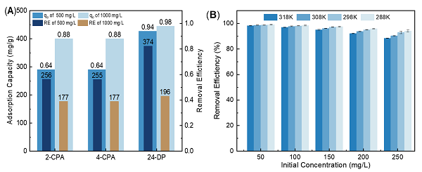研究中选取多种苯氧羧酸类除草作为处理对象,并进行了浓度和温度的条件实验(图2)。结果表明,交联氨基壳聚糖对多种不同浓度的苯氧羧酸类除草剂均有较高的吸附能力。此外,研究发现低温有利于吸附进行,表明该类吸附剂无需加热即可直接应用于常温环境下的水处理。