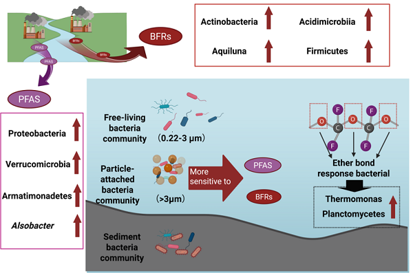 微宇宙实验解析了PFAS与微生物相互作用过程。河流与海洋两种模拟环境中,PFOA在水-沉积物界面的分配行为存在显著差异。从微生物响应来看,海洋系统中细菌群落的α多样性与 PFOA 浓度呈显著负相关,且PFOA对水体细菌群落组成的影响强度远大于沉积物。分析还发现,大部分对PFOA敏感的细菌属仅短期存在于某一时间阶段,群落响应不具有长期稳定性,而 Limnobacter属在不同体系中均表现出稳定响应,因此,可作为PFAS长期污染监测的潜在生物标记类群。