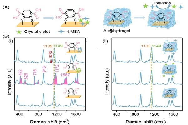 海岸带水体与环境界面pH值的在线精准测量是海洋生态环境过程研究的关键环节。表面增强拉曼散射(SERS)光谱技术因其独特的分子指纹识别能力、高灵敏度和快速响应特性,成为该领域内兼具高抗干扰性和环境适应性的在线监测新技术。其中,基于标记分子的SERS传感策略,通过探针与目标物作用产生的光谱变化实现检测。目前pH传感最常用的4-巯基苯甲酸(4-MBA)探针,其羧基的pH响应拉曼信号较弱,且复杂样品基质中干扰物的拉曼信号易与探针信号发生重叠,二者共同限制了SERS pH传感在酸性环境中的准确性与可靠性。为攻克SERS pH传感在酸性环境监测中的技术瓶颈,中国科学院烟台海岸带研究所海岸带生态环境监测与健康研究组(陈令新研究员团队)张志阳研究员研制了一种基于新型SERS探针与水凝胶隔离保护的在线光学pH传感器,为复杂环境介质中实现高准确性、抗干扰、连续在线的pH监测提供了全新的研究思路与技术范式。