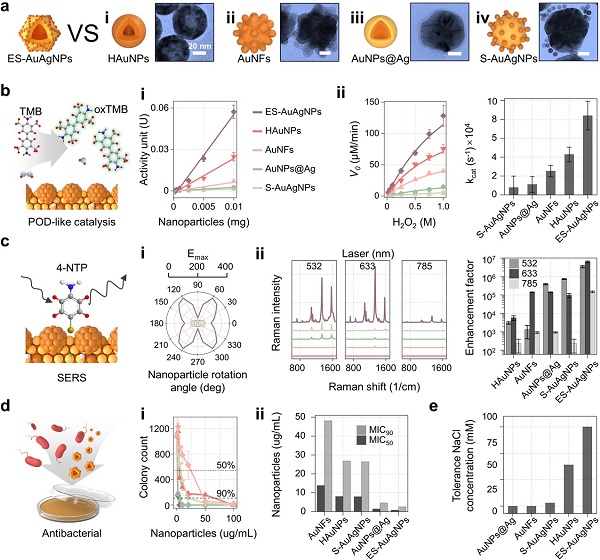 图2.ES-AuAgNPs的多性能评估:(a)与多种常见的等离子纳米材料进行性能PK;(b)类过氧化氢酶性能评估;(c)SERS性能评估;(d)杀菌性能评估;(e)稳定性评估。