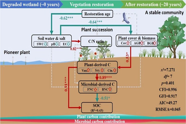 在植被恢复对土壤有机碳的影响机制研究中,团队进一步采用结构方程模型与随机森林分析方法,揭示了植物源碳对土壤有机碳固存的关键作用。分析结果显示,植物覆盖度和土壤碳氮比率(C/N)分别是影响木质素和微生物残体碳动态变化的主要环境因子。值得关注的是,植物源碳(尤其是木质素衍生碳)是土壤有机碳固存最强的正向预测因子,微生物源碳则表现为虽微弱但显著的负向影响。这一现象可能与部分恢复条件下微生物代谢速率加快或其残骸累积效率降低有关(图2)。本研究不仅证实了植被恢复能够显著促进滨海湿地土壤有机碳固存,更进一步明确了植物源碳在其中的主导作用。尽管微生物源碳在短期内对土壤有机碳积累具有一定贡献,但长期而言,植被恢复及其带来的植物源碳增加,才是持续提升湿地碳汇功能的关键机制。该成果为滨海湿地碳汇能力提升提供了重要理论支撑,也为未来湿地生态恢复与碳管理策略的优化,奠定了坚实的实证基础。