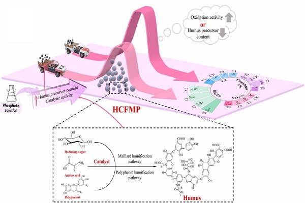 针对海藻生物质资源化过程中腐殖化速度慢、碳氮易流失的痛点,团队提出磷酸盐与高碳锰铁颗粒(HCFMP)耦合添加策略,将其应用于海藻-玉米淀粉糖渣共堆肥体系。平行因子分析与紫外光谱表征显示,该耦合处理形成了“刺激-催化”协同机制:磷酸盐促进胞外聚合物(EPS)生成,为腐殖化提供充足前体物质;HCFMP 则利用其路易斯酸位点与催化氧化特性,加速前体聚合,从而同步提升腐殖化速率与程度(图1)。处理组胡敏酸/富里酸比率达4.38,较对照组提前14天达到成熟标准;同时氨排放减少48.6%,硝酸盐含量提升12%,实现了氮素保留与腐殖化效率的双重优化。值得关注的是,耦合处理后的堆肥产品仍保持海藻固有的植物刺激活性,种子发芽指数均超过101%,且可通过稀释调控有效控制盐分风险。这为将海藻生物质转化为高效生物刺激素类有机肥提供了可行路径,也为发酵型海藻饲料添加剂的研发提供了新方法。