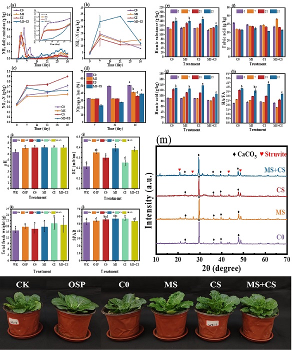 针对牡蛎壳高碱性、难降解、在土壤中作用迟缓的特性,团队构建了牡蛎-豆粕-玉米淀粉糖渣共堆肥体系,创新性引入硫酸镁(MS)和过磷酸钙(CS)作为矿物添加剂,系统提升了堆肥过程中的氮素保留率、腐殖化效率与最终肥效。研究证实,过磷酸钙通过中和牡蛎壳碱性、调节堆体pH至微生物适宜区间(6.5-8.0),显著促进了还原糖、氨基酸、多酚等腐殖质前体物质转化,最终堆肥产品中腐殖质含量达168.28 g/kg,胡敏酸含量136.83 g/kg,胡敏酸/富里酸比率高达4.35,均为各处理组最优。同时,过磷酸钙有效减少氮素流失,较对照组降幅达15.10%,盆栽试验中更使小白菜鲜重提升23.50%。而硫酸镁与过磷酸钙复合处理(MS+CS)则通过形成鸟粪石(MgNH4PO4・6H2O)有效固定氮素,显著降低氨挥发损失。该过程需严格控制用量,以避免电导率过高影响堆肥成熟度。该技术不仅实现了牡蛎壳生物质的高效资源化,其堆肥产品更可有效改良酸性土壤,为沿海地区生物质废弃物处理与土壤生态修复提供了一条可行的双赢方案。