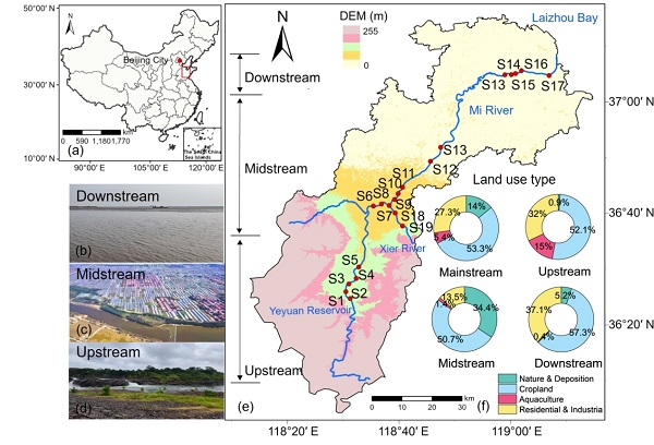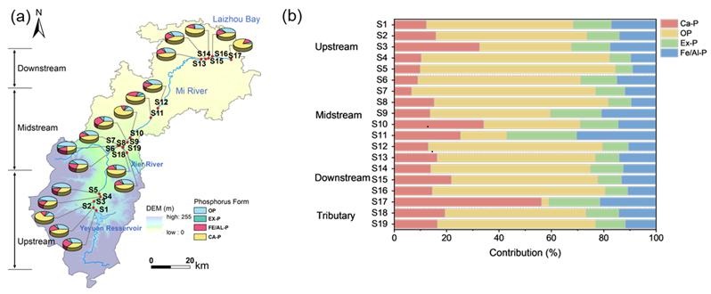 研究团队沿弥河流域自上游至下游共布设了19个采样点(图1),于2024年11月采集了表层(0-10cm)沉积物样品,并同步监测上覆水化学特征,以揭示沉积物-水界面磷的迁移扩散机制。研究发现,弥河流域沉积物中的磷含量具有明显的纵向分异特征,自上游至下游呈现递减模式(图2a);同时,沉积物向上覆水释放磷过程以有机磷为主要来源(图2b)。