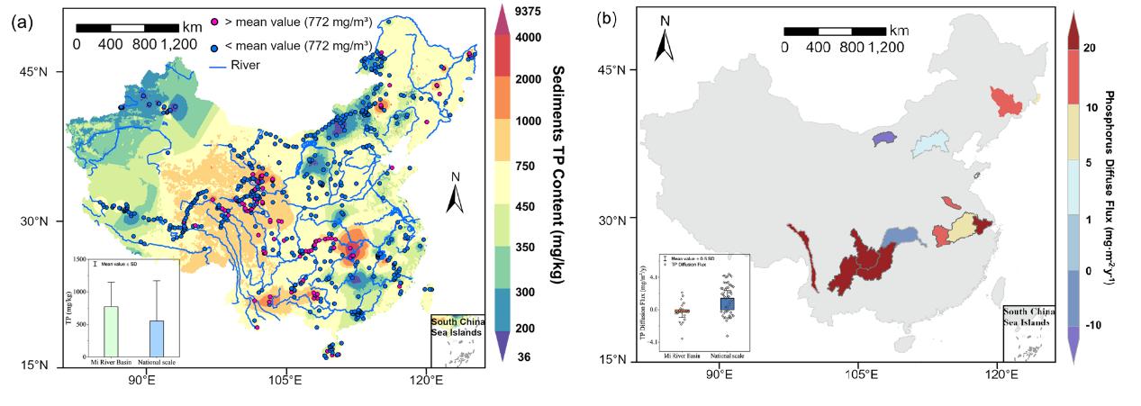 研究进一步整合了全国2304个沉积物总磷(TP)含量数据,并对14个小流域的磷扩散通量进行分析(图3),以揭示了我国沉积物磷的空间分布特征和及输运转化规律。结果显示,西北地区沉积物总磷含量偏低,中西部及东北部与弥河流域相当;沉积物磷扩散通量高值区主要集中于我国西南部及沿海,多数小流域表现出沉积物向上覆水释放磷的趋势。