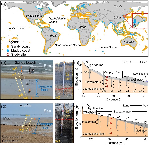 沙质和泥质海岸分别占世界无冰海岸线的31%和14%(图4a),其潮间带含水层是调控营养盐入海“组成”与“通量”的关键界面。以往研究多将潮滩沉积物视为均质体系,但实际普遍存在“表层细粒沉积物覆盖于粗粒沉积层”的垂向分层结构(图4b,d)。这种分层如何影响地下水中营养盐的迁移、转化与向海输送通量,其机制尚不清晰。为此,研究团队选取典型沙滩与泥滩两类潮间带剖面,开展多深度地下水采样,系统分析溶解态氮、磷、硅和碳的空间分布特征,并同步监测了地下水位的变化(图4c,e),以揭示潮间带地下水中营养盐迁移转化的关键驱动机制。