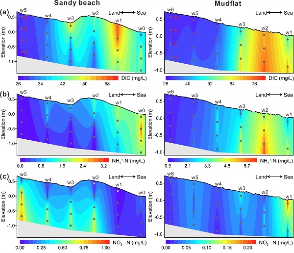 此外,沙滩是地下水排放的热点区域,其向海输送的溶解态营养盐和碳通量比泥滩高出约两个数量级。表层细粒沉积物的存在显著增加了地下水输送的溶解无机碳(DIC)和NH4+通量,可能加剧近海富营养化与酸化风险(图6)。这些结果表明,潮间带沉积物的垂向分层结构是调控地下水中营养盐与碳向海输送组成和通量的关键因素,并提示通过调控沉积结构,有望增强潮滩对陆源营养盐的自然净化功能。