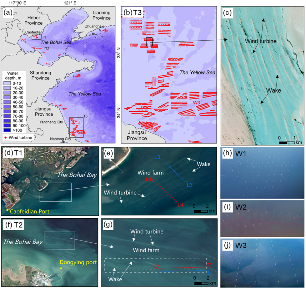 图1 2024年中国北部海域风电塔分布与风电塔悬沙尾迹影像