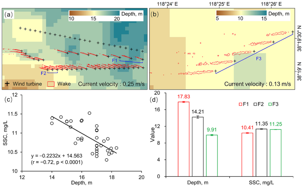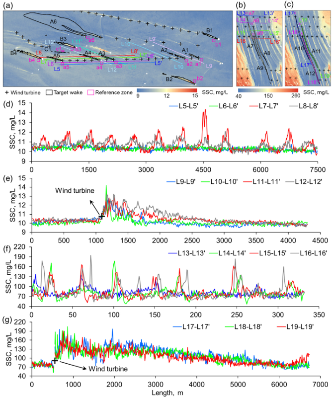 基于Sentinel‑2 光学影像分析,研究构建了海上风电塔下游尾迹及其泥沙浓度遥感反演模型。结果显示,单座风电塔引发的尾涡效应可导致泥沙浓度升高超过20%,尾迹的影响面积可达1.5 平方公里。据此估算,中国北部海域受风电塔影响的水域总面积近6000平方公里,该数据与风电塔的物理分布面积相当;进一步研究指出,水深、流速、桩基大小与风机密度是影响悬沙尾迹强度的关键因素。