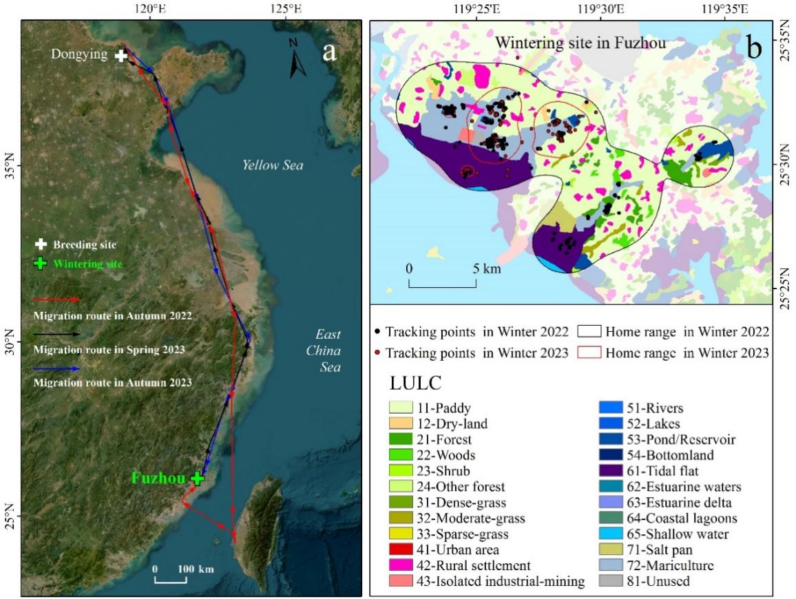 研究结果显示:(1)来自同一繁殖地的反嘴鹬个体的越冬地各异,其分布范围南北跨越达11个纬度。(2)追踪个体对繁殖地与越冬地均表现出较高的栖息地忠诚度,且在繁殖期与越冬期内的活动范围均较为集中。(3)该物种偏好选择地势平坦、植被覆盖度低的浅水型低洼生境,其栖息地以盐田、水产养殖塘、稻田等人工湿地为主要土地利用类型。研究进一步强调,在自然湿地大量丧失和退化的背景下,人工湿地作为水鸟的重要替代性栖息地,急需得到重视。本研究可为水鸟栖息地保护与湿地资源可持续利用提供数据支撑与方法参考,具有较强的实践指导意义。