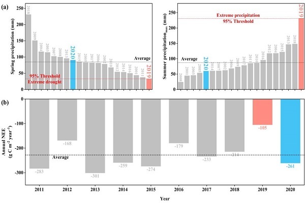 图2 (a)春季极端干旱和夏季极端降水事件的定义以及(b)2011-2020年湿地NEE年际变化动态
