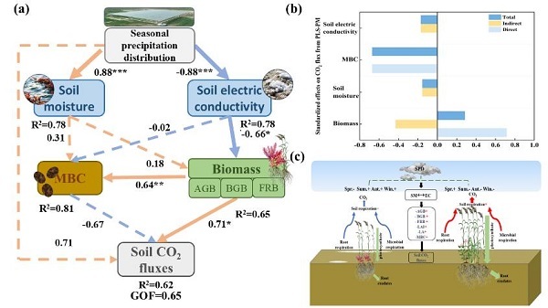 图3(a)土壤二氧化碳通量偏最小二乘路径模型;(b)标准化效应图;(c)季节性降水分布对土壤碳排放影响的示意图