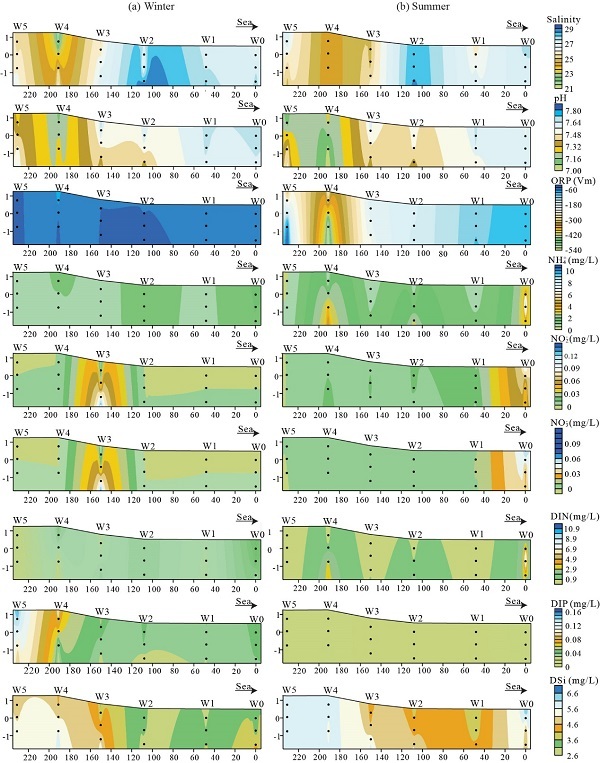 图1 红树林潮间带中地下水营养盐(氮、磷、硅)的季节性分布