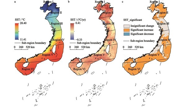 图2 2001—2021年中国东部地区海表温度(SST)的空间分布特征:多年平均值(a),年际变化率(b)以及显著性(c)