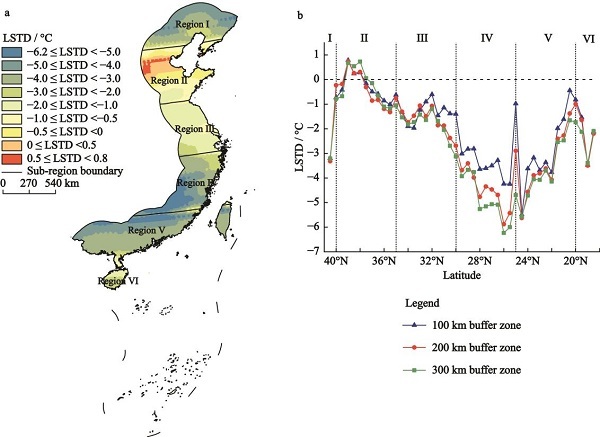 图3 2001—2021年中国东部地区海陆温差多年均值的空间分布特征(a),及其距离海岸线100 km、200 km和300 km缓冲区范围内的纬向差异特征(b)