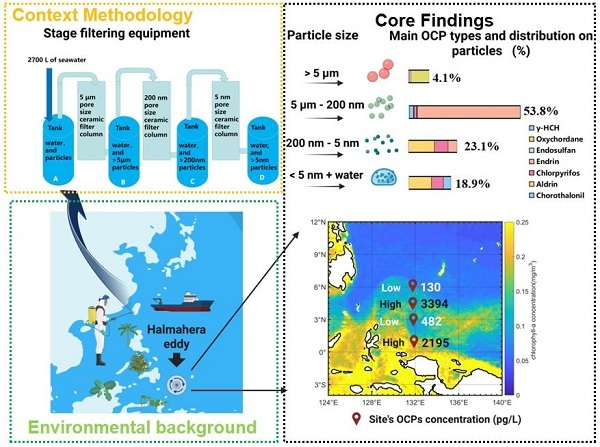 有机氯农药(OCPs)作为典型持久性有机污染物,具有强挥发性、长距离迁移性和生物累积性,其在全球海洋中的分布传输及生态影响一直是环境科学领域的研究热点。西太平洋作为全球生物地球化学循环中的关键污染物汇,其OCPs污染现状与迁移机制尚缺乏系统认知。近期,中国科学院烟台海岸带研究所海岸带环境过程研究组(唐建辉研究团队)联合多方力量,通过海上科考、分级过滤采样及多维度数据分析,首次系统阐明了西太平洋OCPs的空间分布特征、不同粒径颗粒吸附规律及涡旋富集机制,明确了海洋动力过程、污染物理化性质等关键调控因素,为全球持久性有机污染物的海洋环境风险评估与污染防控提供了重要科学依据。