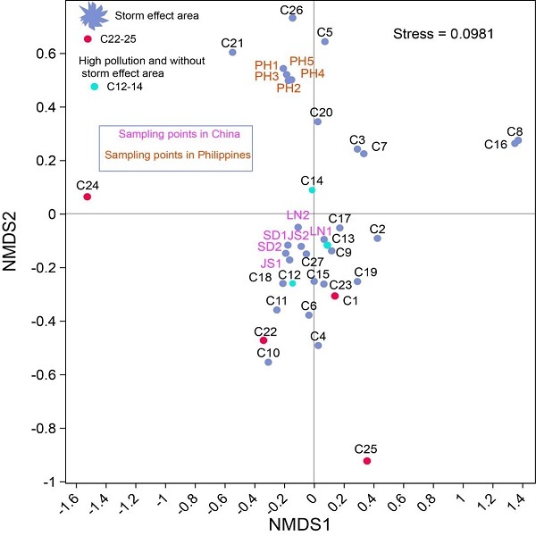 图 4基于HCHs组成特征对西太平洋大气OCPs样本的非度量多维尺度(NMDS)分析